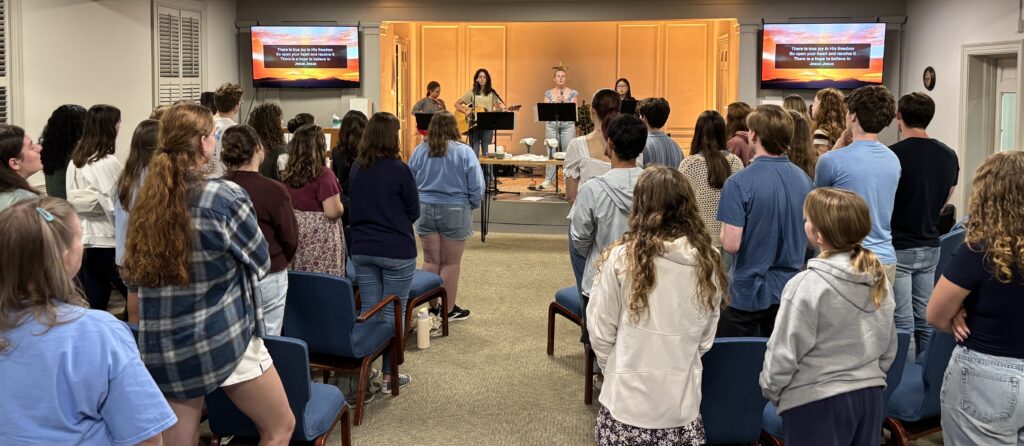 Wesley’s main weekly gathering is Dinner & Worship on Sunday evenings during the academic year. Most weeks, the night begins with a free meal at 6:30 PM in the University UMC Fellowship Hall and continues with a student-led worship service at 7:30 PM in the University UMC Chapel. A few times a year we worship on campus, so check our website for weekly updates.